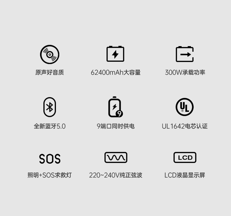 让人眼前一亮的是,虽然结合了电声和便携式储能,但PS300的重量依然维持在相对便携的6KG。此外,音箱除有一个可调节LED灯条外,还有一个圆形应急灯,可以实现照明和SOS闪光求助信号功能。同时,PS300采用防火等级UL94中最高等级的V0级别防火电池,力求为用户提供更多安全保障。