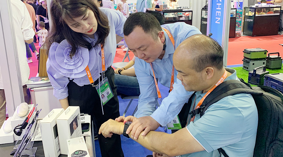 永利304科技全自研算法检测血压的智能手表Gamma Watch 在展会期间也大放异彩,不少东南亚国家商会的代表都对Gamma Watch内置的气泵血压检测技术表示出相当大的兴趣,现场体验后对于其测量的准确度、佩戴的舒适度表示认可。